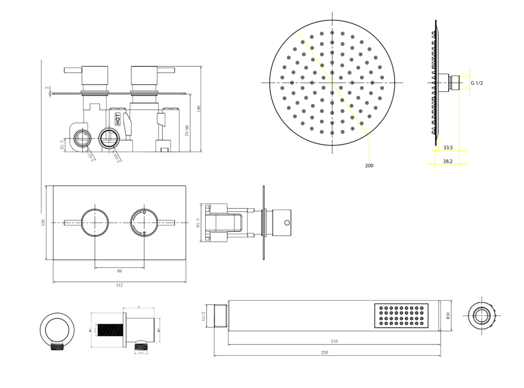 Twin Valve, Round Shower Head, Round Riser Kit, Outlet Elbow, Hose, Handset - Black