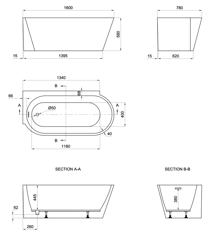 - 1600mm (L) x 780mm (W) x 580mm (H)