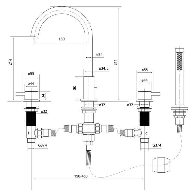 - Separate hot and cold handles.